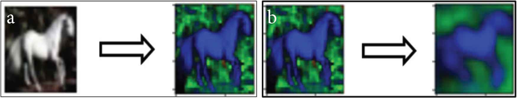The first step of the algorithm is to convert the training dataset images from RGB color model to HSV [10] or TUV as shown in Figure 3a and 3b respectively. Using the Equations (1)–(3) for HSV color model, and Equations (4)–(6) for TUV color model.