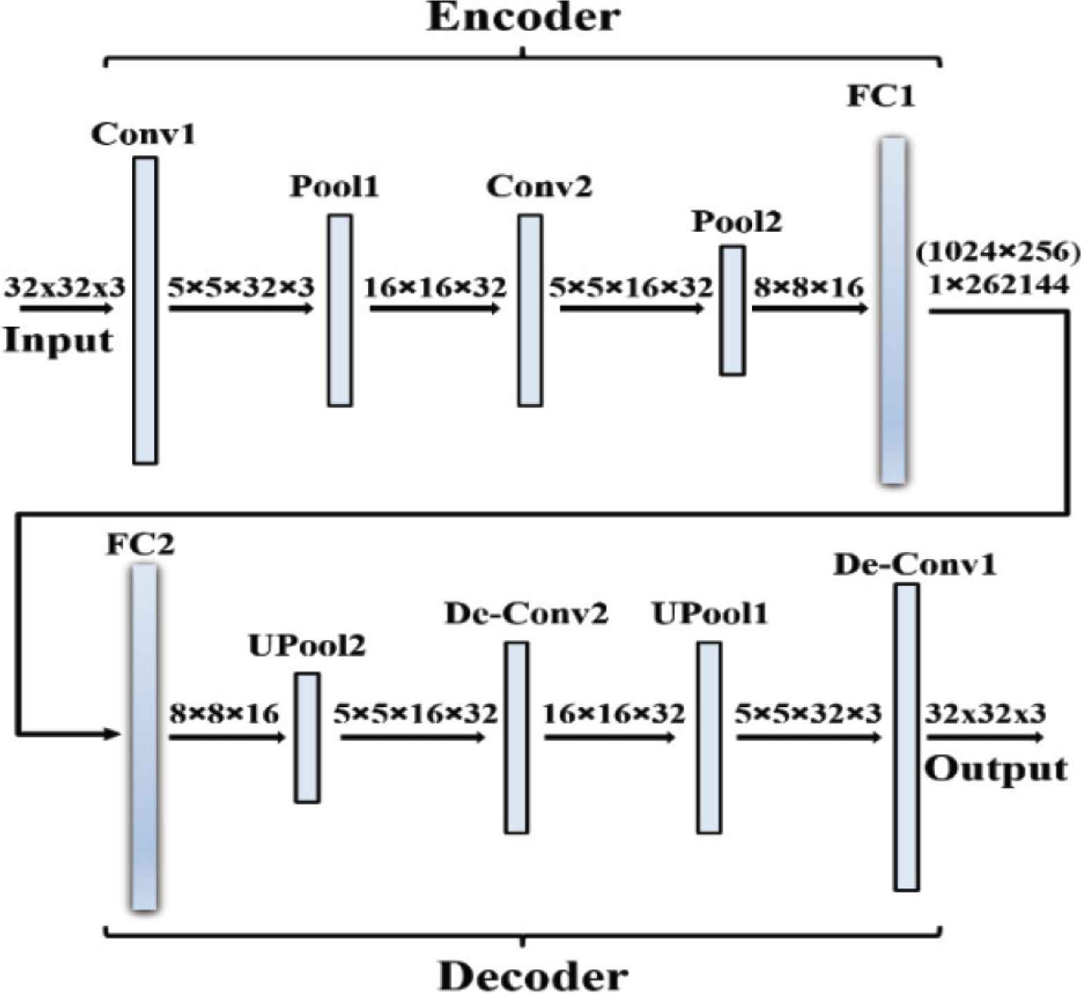 Consequently, the image dimensions are reduced through a pooling layer from size 5 × 5 × 32 × 3 to size 16 × 16 × 32. Next, another convolution layer is applied followed by a pooling layer to change the size of the image from 5 × 5 × 16 × 32 to 8 × 8 × 16. Finally, the encoding process is finalized with a fully connected layer with the output size of 1 × 262144 (1024 × 256). In order to decode the image, the reverse of the previous process is applied and finally a reconstructed image with the same dimensions as the input image is the same as the output.