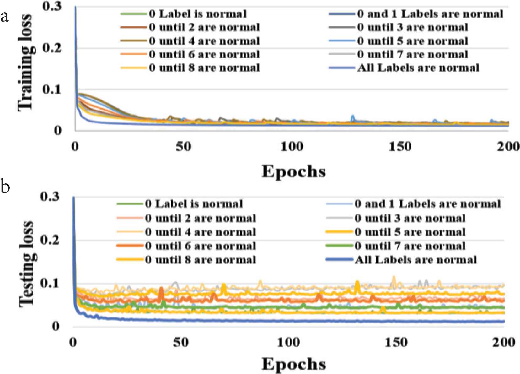 The difference between the test data input images and the reconstructed images were calculated in each epoch. The relationship between the testing loss and the epochs is shown in Figure 6. It is worth mentioning that the value of the test loss is almost similar or close to train loss value and this indicates to a good reconstruction process.