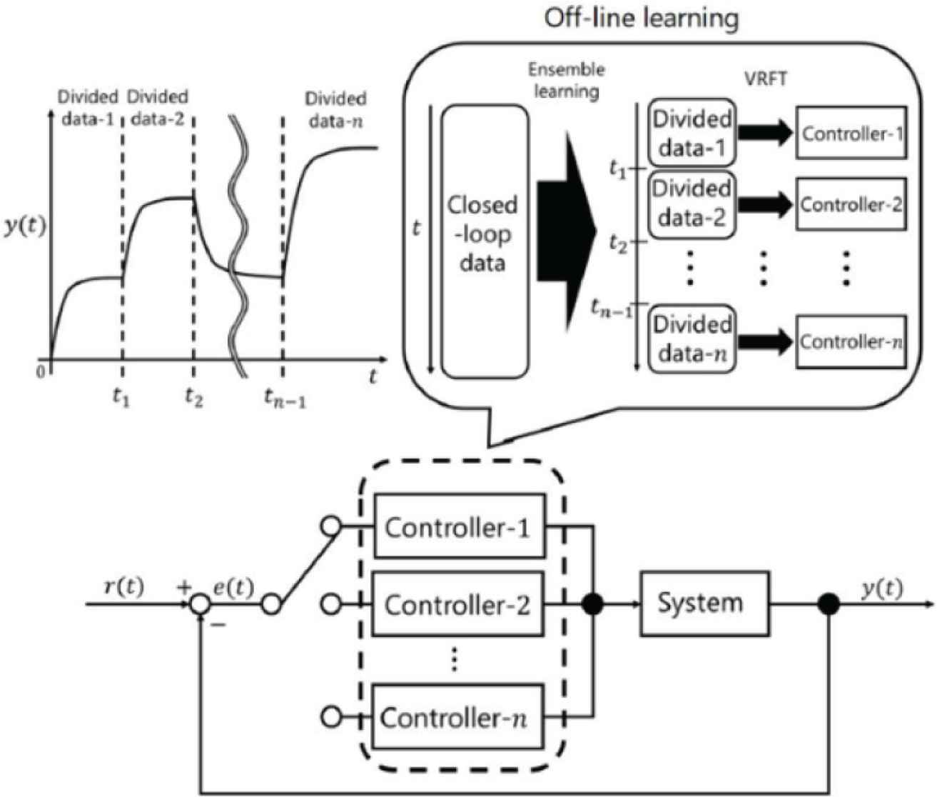 Figure 1 shows the schematic figure of the proposed data-driven control system where multiple controllers (controller-1, controller-2,…, controller-n) are designed using ensemble learning using the initial closed-loop data. First, the closed-loop data is divided into some linear time-invariant systems based on time t (t1, t2,…, tn−1). Next, control parameters are calculated using VRFT for each divided data (Divided data-1, Divided data-2, …, Divided data-n).