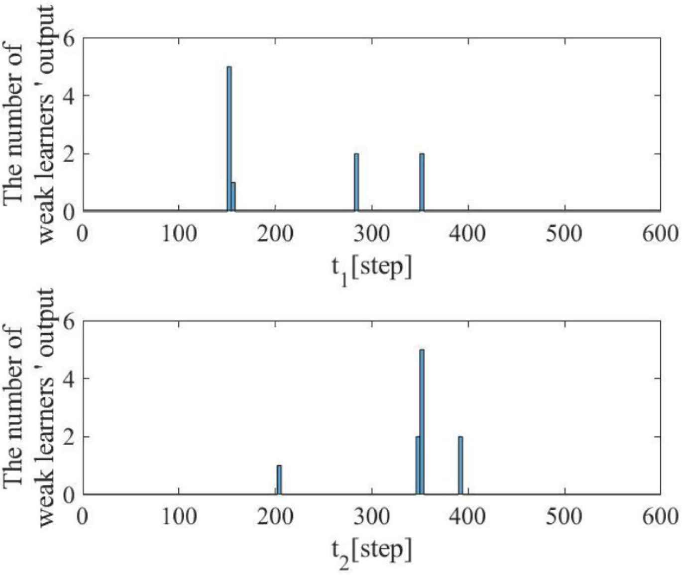 Figure 6 shows the control result applying the proposed scheme. Here, the number of weak learners is 10. Figures 7 and 8 respectively show the estimation result of the system change step in the weak learners and the transition of PI gains in the proposed scheme. Figure 6 shows that good control result can be obtained using the proposed scheme. In addition, Figures 7 and 8 show that the system change step is estimated accurately and PI gains are changed at the proper timing. Finally, the sum of squared errors is 653.9 in Table 1, and the proposed scheme is better than the conventional scheme.