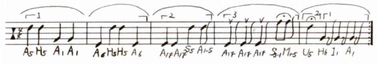 A Tactile Score, where is generally described using staff notation. The third line in the centre shows normal pressure, the downward, is relatively forceful, and the ascending is weak. The alphabet shows the stroke of the massage. The capital A stands for, draw a circle on the cheek, H draws a circle next to the corner of the eye. Each suffix of an alphabet indicates hand part used in massage, e.g. the 5 stands for fingertip, 1 is the palm, so the A5 illustrates the massage of drawing a circle on the cheek with a fingertip.