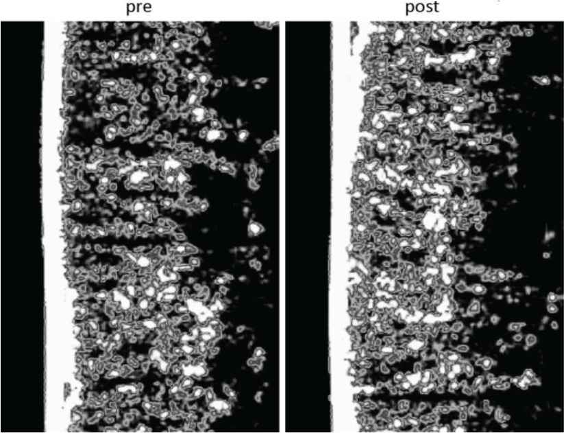 Significant example. The collagen index of pre (left) is 37, while after (right) is 55. Compared with before (pre) black region is enlarged in after (post), it indicates dermal collagen aggregated toward surface of the skin.