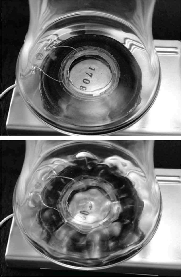 (Top) When only music from the sound exciter gives a sound of music to the container filled with water. (Bottom) When a sound of music, which is synthesized with very low frequency sound is applied (non-audible low frequency) is used. The water vibrates due to the very low frequency of sound contained in music, and causes ripples.