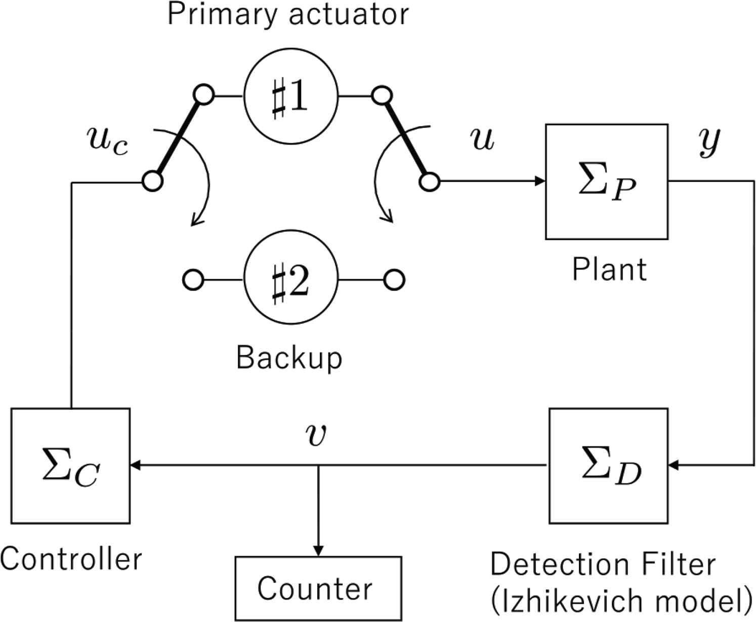 Unfortunately, the conventional SRCSs have utilized an unstable detection filter [1] which is not suitable for the concept of the strong stability [3]. Recently, as a remedy, the well-known Izhikevich spiking neuron model [4] is used as a fault detector. A faulty signal in the control loop excites the neuron model. Hence, just counting up the number of spiking waves makes it possible to find failures. Because the boundedness of all the signals in the neuron model is always guaranteed, the requirement of the strong stability can be satisfied. Of course, the advantages of the original SRCSs are retained. Moreover, by utilizing the spiking neuron model, setting a threshold for fault detection is no longer needed. However, only an issue of sensor failure has been considered. A problem of actuator failure has not been solved.