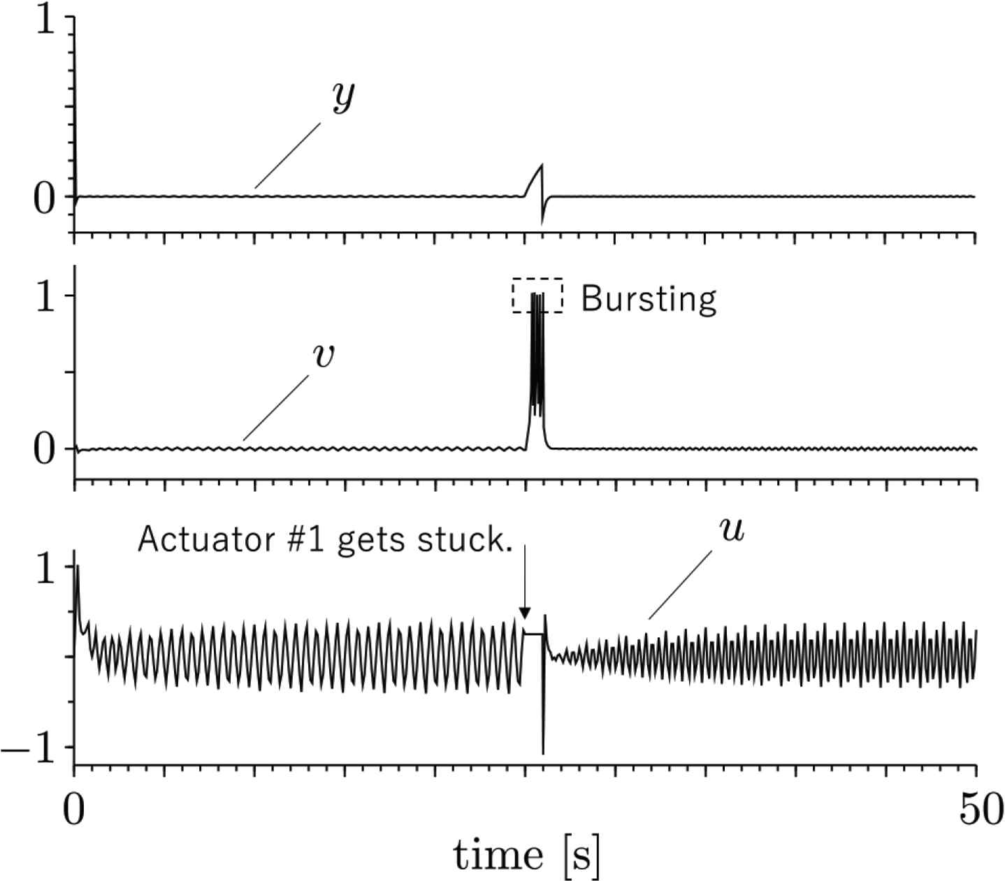 In the above equations, the effect of the control input uc gets lost because the actuator fails. Hence, the bursting occurs in the signal v.