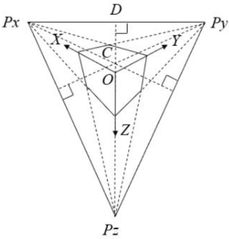As shown in Figure 1, Px, Py, Pz are vanishing points corresponding to three mutually orthogonal directions. The parallel lines that determine the vanishing points are respectively parallel to OX, OY and OZ coordinate axis in the spatial coordinate system O-XYZ. C is the orthocenter of ∆PxPyPz, and D is the perpendicular foot on the side PxPy.