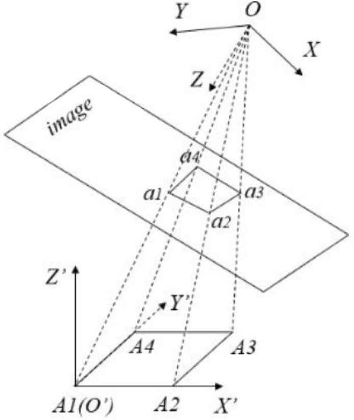 The length of A1A2 and A2A3 are respectively a and b mm based the above algorithm. In the world coordinate system O′-X′Y′Z′, the coordinates of A1, A2, A3, A4 are (0, 0, 0), (a, 0, 0), (a, b, 0), (0, b, 0). The coordinates of a1, a2, a3, a4 correspond to (x1, y1), (x2, y2), (x3, y3), (x4, y4) on the image plane.