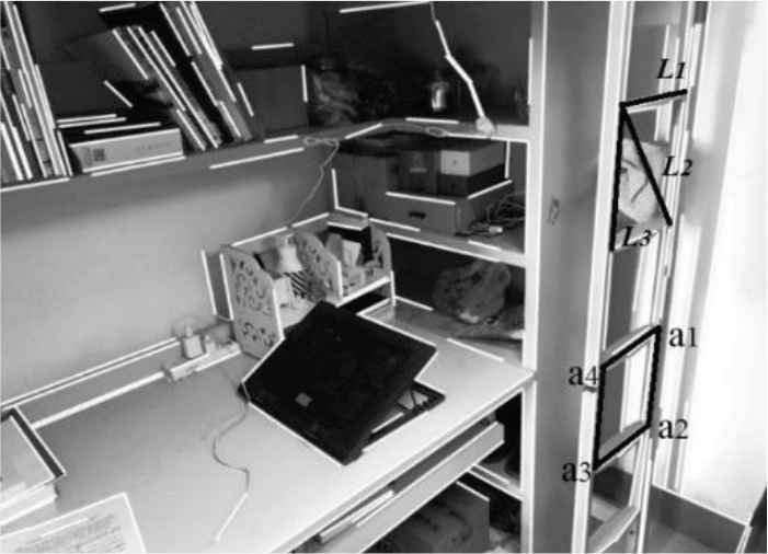 As shown in Figure 4, we select three line segments (L1, L2, L3) which all belong to the spatial plane corresponding to quadrilateral a1a2a3a4, and measure the lengths based on the single image. The experimental results are compared with the results using handheld measurement tool.
