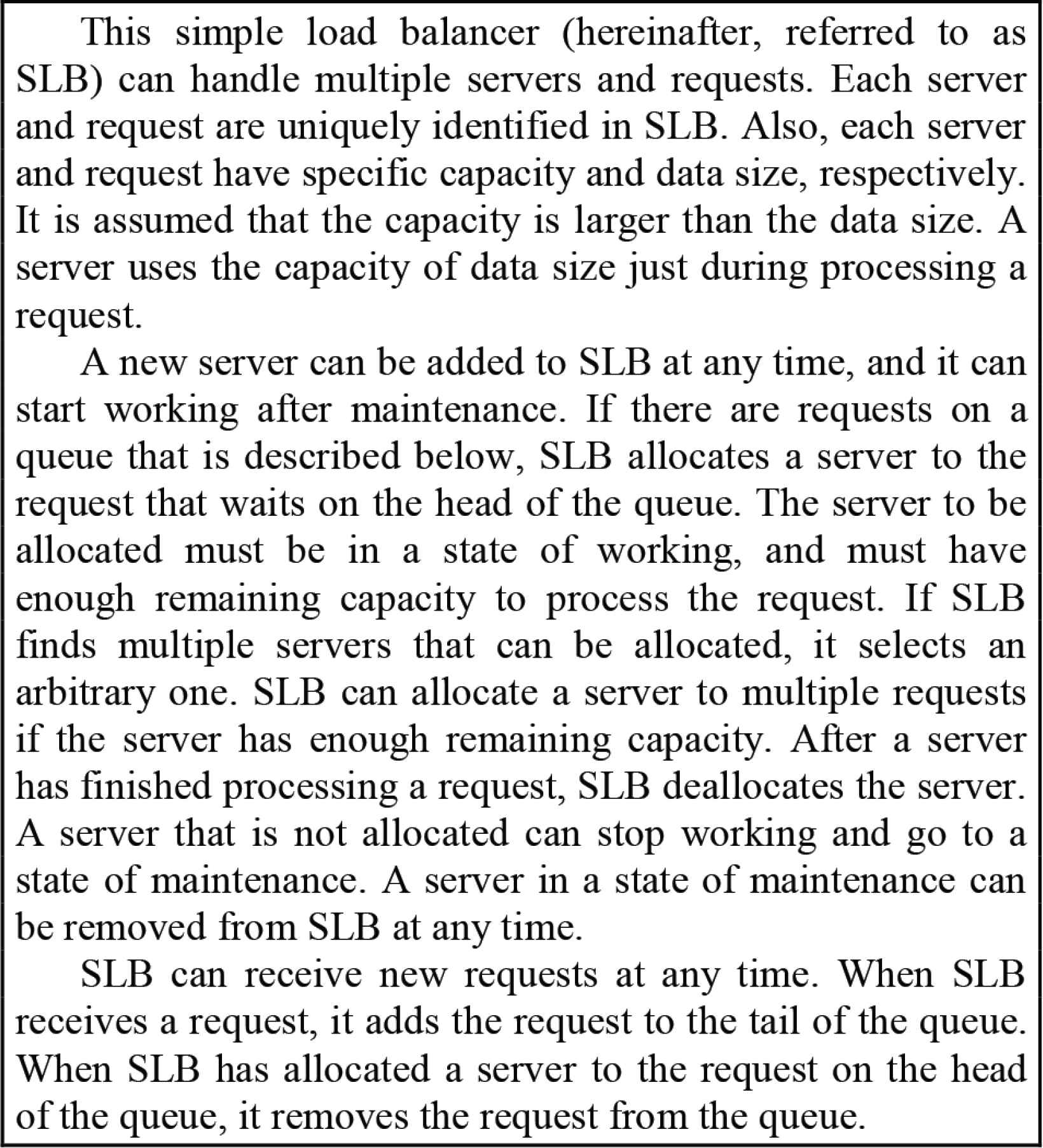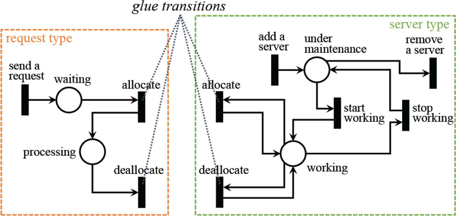 We introduce an example given in Figure 1 in order to discuss this problem. This Simple Load Balancer (hereinafter, referred to as SLB) contains multiple servers and requests as objects. All server objects have the same behavior, and also all request objects have the same behavior. However, when the behavior of SLB is defined as an EPN model, each object is defined as a sub-EPN model that represents the behavior of each object. That is, if ns and nr are the maximum numbers of servers and requests that can be handled at the same time by SLB, an EPN model of SLB will contain ns and nr sub-EPN models for server and request objects, respectively. There are interaction between the server objects and the request objects. If ng is the number of glue transitions to specify the interaction between one server object and one request object (that is, to connect between two sub-EPN models that represent the behavior of one server object and one request object, respectively), the EPN model of SLB will have ng × ns × nr glue transitions. Additionally, if there are interaction among the server objects and/or among the request objects, a larger number of glue transitions is needed.
