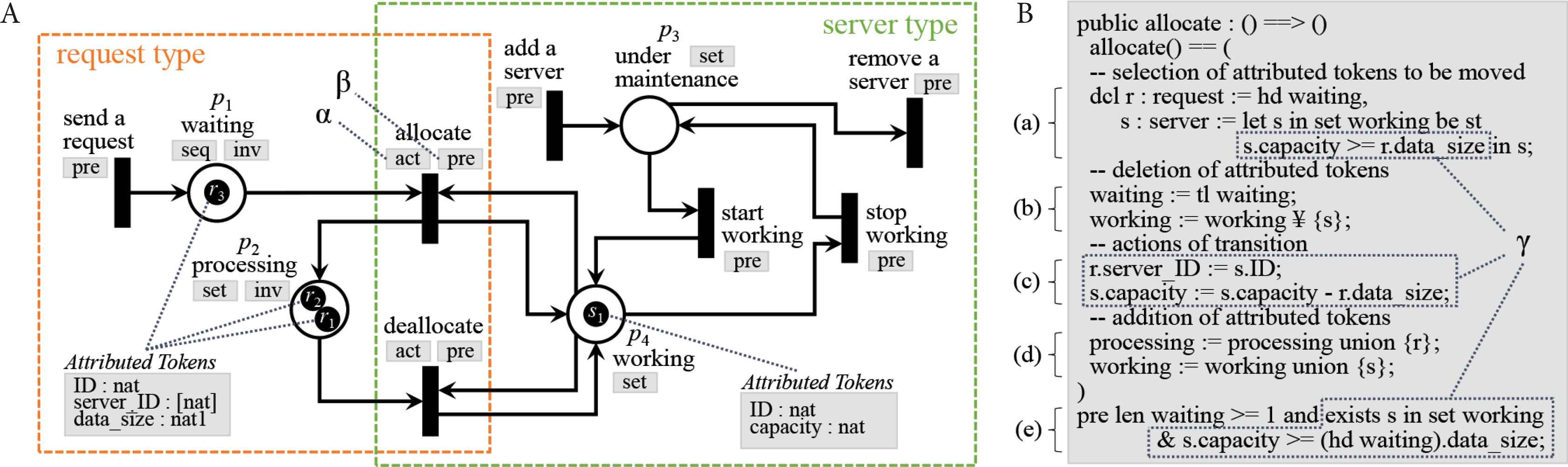 Figure 2B shows VDM++ codes of the glue transition “allocate”. The statement (a) specifies the way of selection of attributed tokens to be moved. The statements (b) and (d) specify the way of deletion and addition of attributed tokens on the related places, respectively. Note that the Yen sign corresponds to a backslash. The statements (c) specify the actions to be executed on the transition, and they correspond to the label “act” that is pointed by “α ” in Figure 2A. The statement (e) specifies the pre-condition that needs to be satisfied just before the fire of the transition, and it corresponds to the label “pre” that is pointed by “β ” in Figure 2A. In Figure 2B, the codes that are pointed by “γ ” need to be considered and written based on software requirements by engineers, but the others can be generated from Figure 2A.