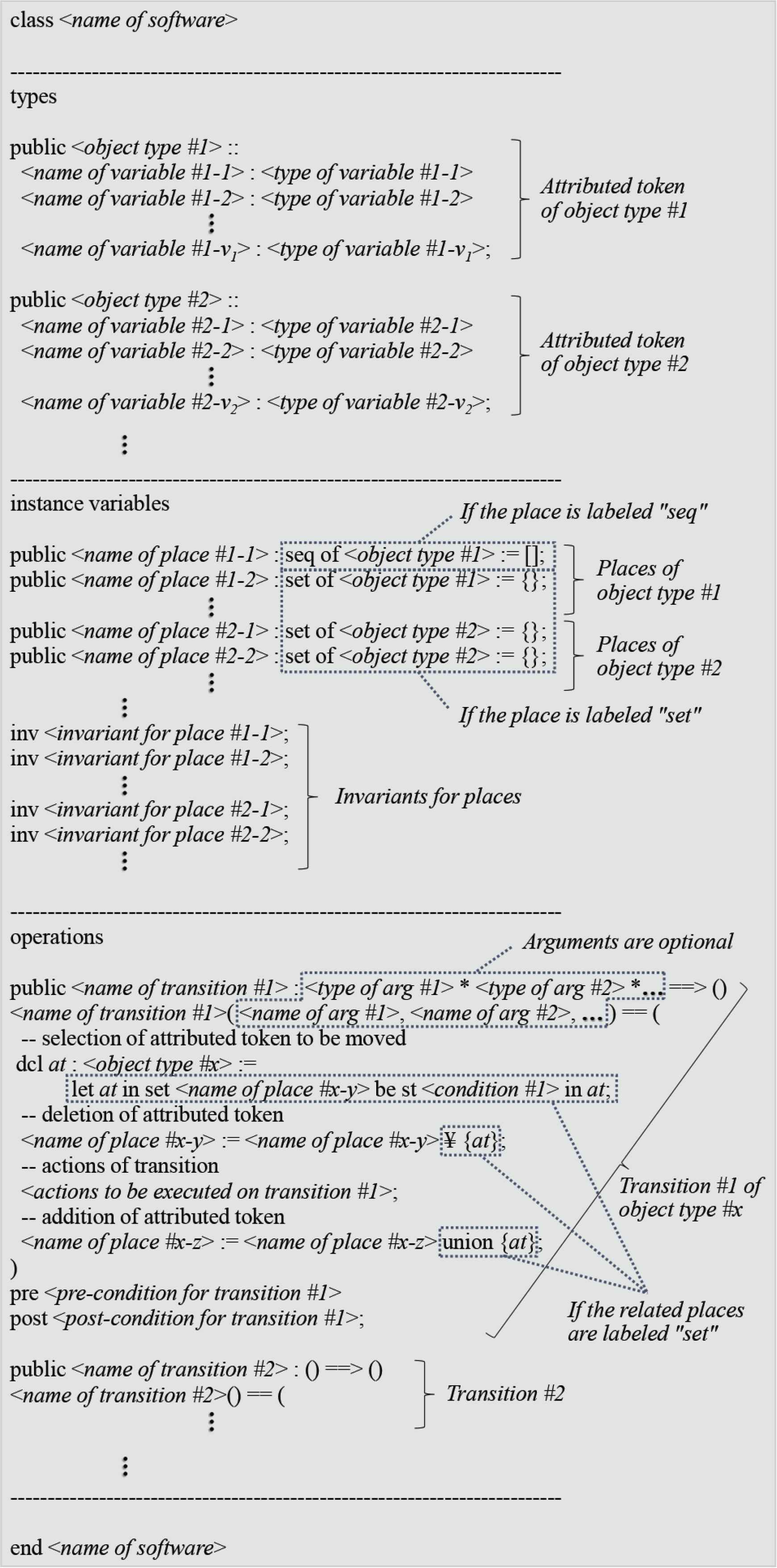 The EPNAT model is converted to a VDM++ specification. Figure 4 shows our coding pattern to perform this conversion systematically. The codes shown in the form of <terms> mean that actual VDM++ codes are extracted from the EPNAT model, or are written by engineers. Also, “#a - b” means the bth element (such as a variable and a place) of object type #a.