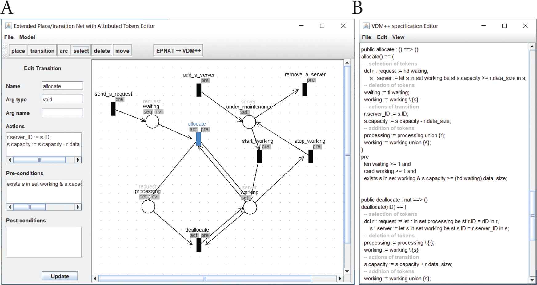 Screen shot of our prototype tool. (A) EPNAT model editor. (B) VDM++ specification editor.