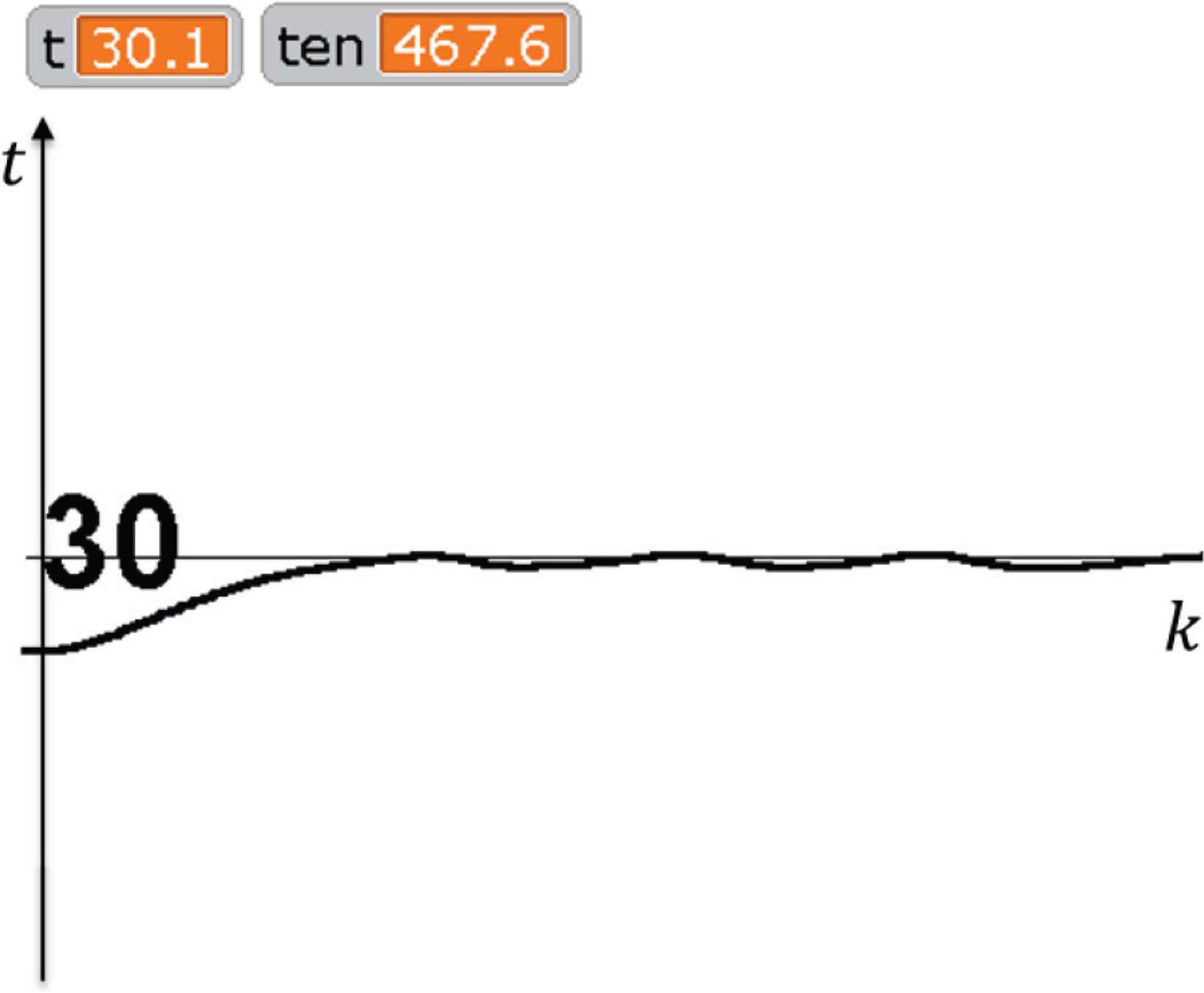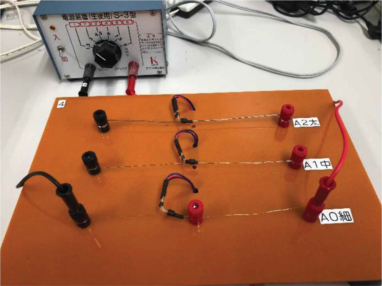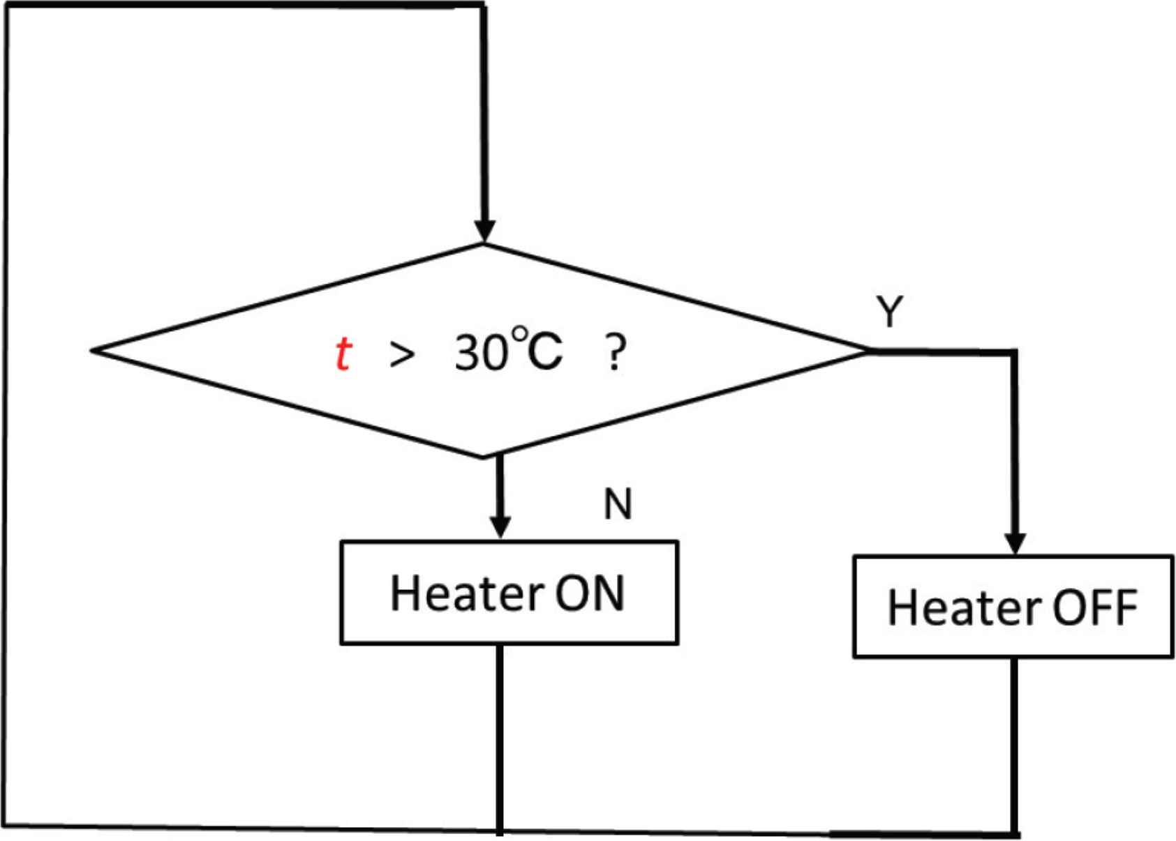 When constructing the temperature control systems, the control method is important. But also, the selection of the heater is important. In the case of a temperature control system using a heating wire, the resistance of the heating wire is important. The temperature control learning system proposed in this study can use three heating wires of different thickness. Of course, a thick heating wire has a smaller electric resistance value and a large current, so the amount of heat generation due to Joule heat increases. The temperature control learning system is shown in Figure 1. The switching of a heating wire uses Field Effect Transistor (FET) 2SK4017. A computer is required to supply the gate voltage to the FET. In this study, we use Studuino compatible Arduino for this purpose. Studuino has Analog input which can do 10 bit A/D conversion. The schematic figure of the temperature control system is shown in Figure 2. The temperature of the heating wires can be measured by a thermocouple and captured thorough 10 bit A/D conversion. The control algorithm used in this experiment uses ON–OFF control that a beginner makes first. Figure 3 is the flowchart of ON–OFF control. This section uses the same control law to confirm that the control performance differs depending on the difference in hardware. As hardware, a combination of thick heating wire and thin heating wire, high voltage, and low voltage were prepared. First, when a low voltage is applied to a thin heating wire, the target temperature is not reached. The result is shown in Figure 4. In Figure 4 “ten” of Equation (1) is the calculation result of the performance index set as a = 3.0. Since this value is calculated based on the summation of Equation (1), it only increases with the progress of time. Therefore, a small value means good control performance. Figures 4–8 are the figure that shown on the operation window of the students. The trajectories of these figures are the time series output temperature behavior. Students know the control performance by checking the trajectories and the index ‘ten’. Students will try to improve the temperature system and programs in order to increase this number. And ‘t’ is the current temperature. The “ten” in Figure 4 is the lowest value in all results. Figure 5 shows the result of applying a low voltage to a thick heating wire. The target temperature is reached, and the variance of the control error is also small. However, the rise time takes a lot. The “ten” in Figure 5 is better than Figure 4. Figure 6 shows the result of applying a high voltage to a thin heating wire. Although the rise time is shorter than Figure 5, the variance of the control error is slightly larger. Figure 7 shows the result of applying a high voltage to a thick heating wire. Although the rise is very good, it cannot be stabilized around the reference value by the ON–OFF control. Finally, Figure 8 is shown as a reference result. Figure 8 shows the result of PI control instead of the ON–OFF control shown in Figure 3. The “ten” of Figure 8 is the best of all results. PI control is one of the feedback control methods which can use the control input except for ON and OFF.