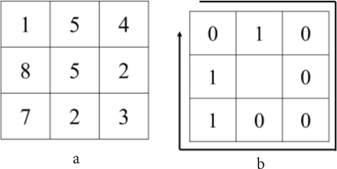 An input image is gray-scaled as shown in Figure 1a, and the brightness values of the pixel of interest and its eight adjacent pixels are compared. If the gray value of an adjacent pixel is larger than or equal to that of the center pixel, the adjacent pixel is given 1, otherwise given 0. By aligning the obtained 0 and 1 from the top-left pixel in the direction of the arrow shown in Figure 1b, an 8-digit binary number is derived, which represents the center pixel.