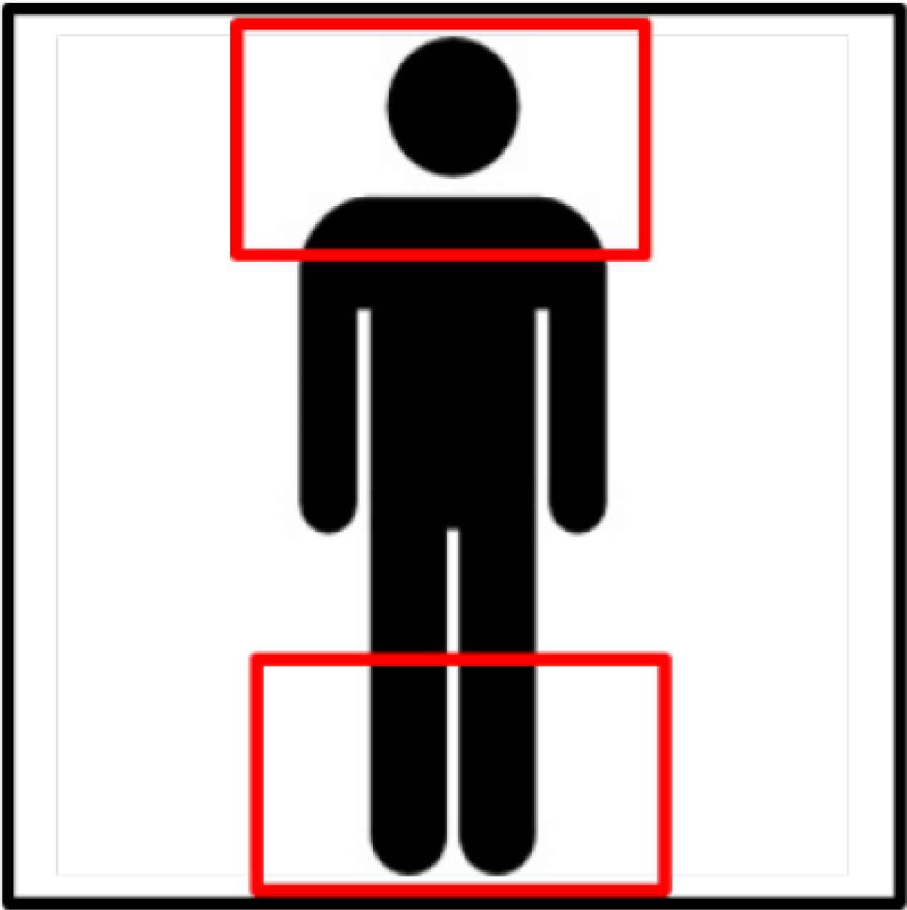 The head and the lower body of a fallen person are detected using the angle at which the gradient histogram in the circular region obtained in Section 2.1.3 has a peak. When a fallen person exists in a detection window in the orientation shown in Figure 2, the horizontal gradient becomes large and the peak angle of the gradient histogram is 0° or 180°. Therefore, the areas shown by the red frame in Figure 2 are the estimated head position. Let us assume that the posture of a fallen person is straight. Then, if the peak angle in the gradient histogram is denoted by ωpeak, the angle ω indicating the orientation of the head is provided by
