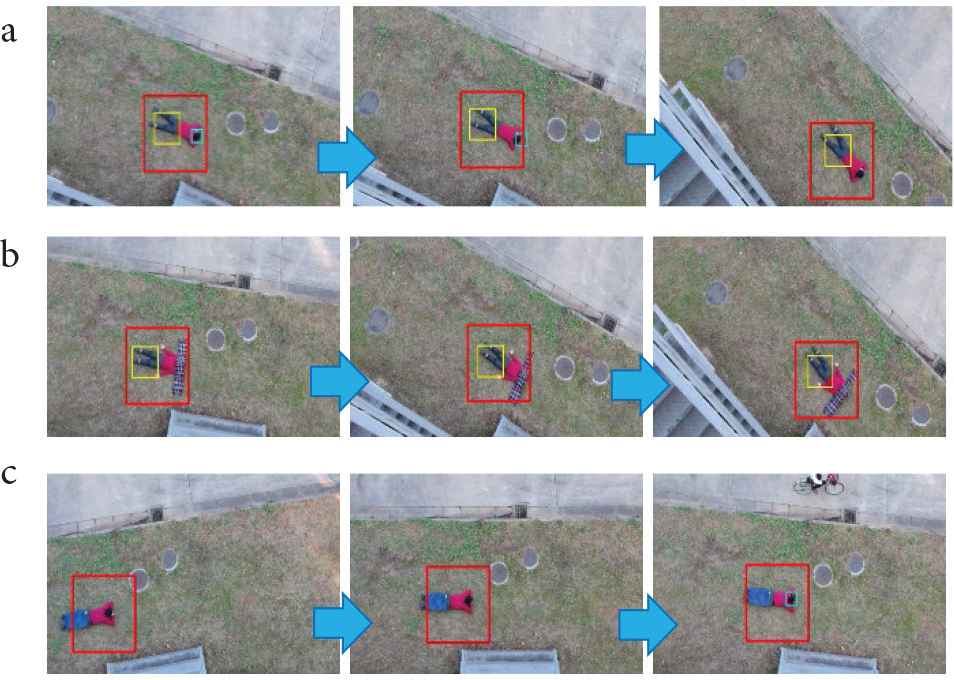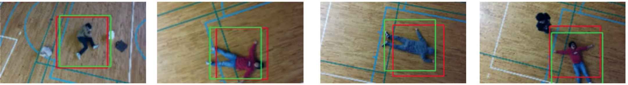 The designed detectors are applied to nine bird-eye view videos, in three of which a fallen person’s head part is occluded and in other three of which the person’s lower body is occluded. For the judgment on the detection, IoU is again used. The threshold is set to 0.4 in this particular experiment.