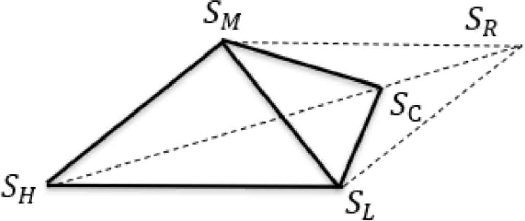 SC is determined as SC = (1 − η)SG + ηSH, where η is set as 1 > η > 0, and it corresponds to the ratio of distances SCSG and SHSG.