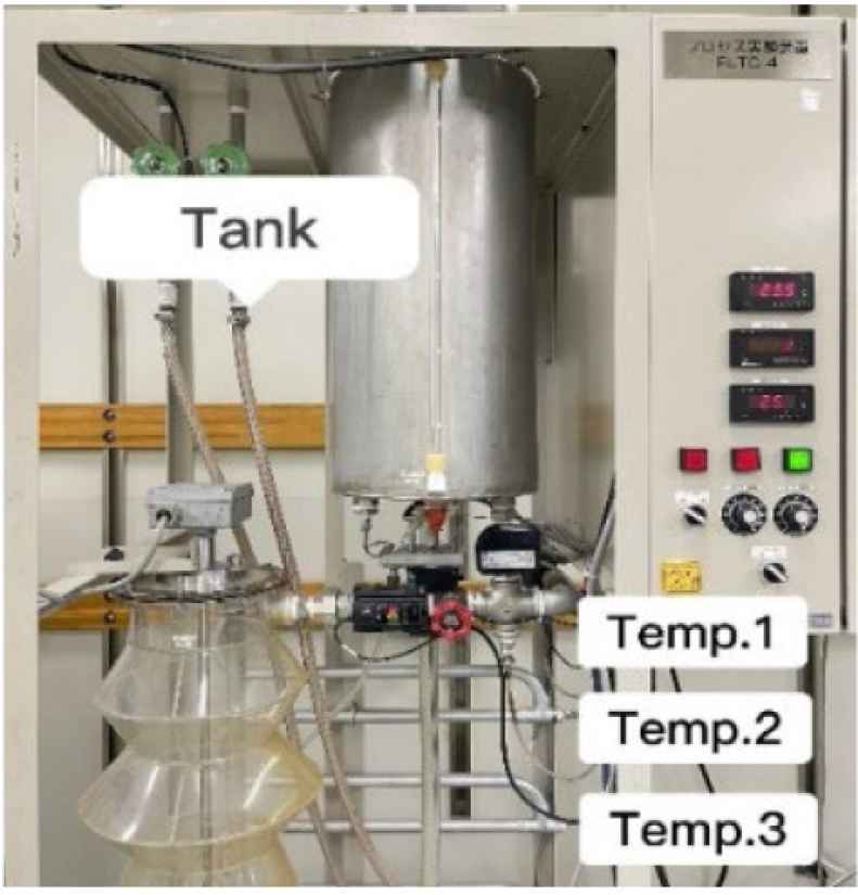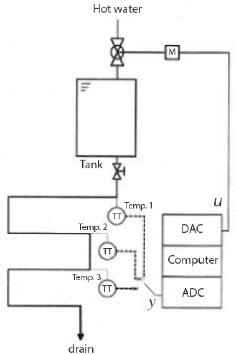 The proposed method is applied to a tank system which is shown in Figure 7. The schematic diagram of the process system is shown in Figure 8. In this system, there are three pipes. When the water is flowing along with the time, the temperatures at three points mentioned above are measured and displayed in Temp.1, Temp.2 and Temp.3. The temperature sensor in the tank system transmits the sensed water temperature signal to the controller. The controller compares the measured water temperature signal with the set signal to obtain the deviation. Then according to the nature of the deviation, the hot water, cold water, and electric valve sends out “open” and “close” commands to ensure that the tank system reaches the set temperature. It should be noted that the cold water value is set as 10%.