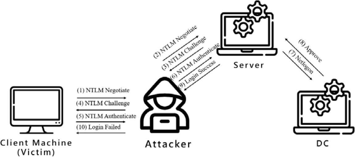 NTLM is a challenge–response authentication protocol as shown in Figure 1. First, the client sends a negotiate message advertising its capabilities to the server. Then the server responds with a challenge message. Third, the client encrypts the challenge message with its username and password as a authenticate message, and then the server will verify whether the password is correct or not.