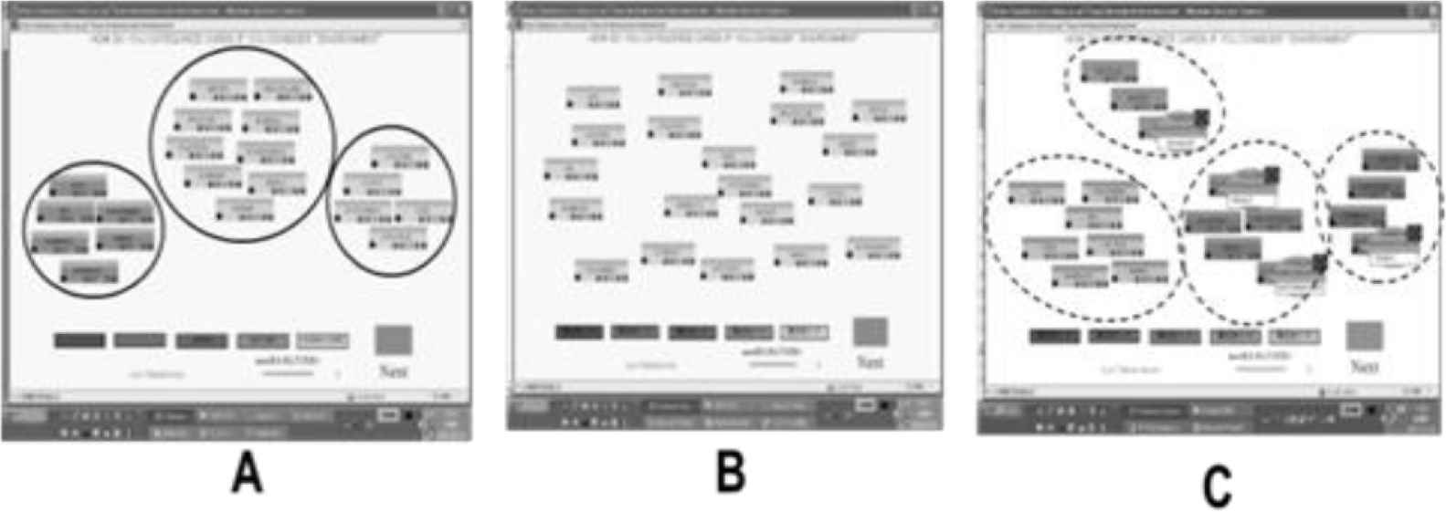 Experimental method: 21 people were divided into six teams and presented with a set of word cards on the screen as follows. Capital letters in the following indicate the names of the clusters, and lower-case letters indicate individual words on the cards.