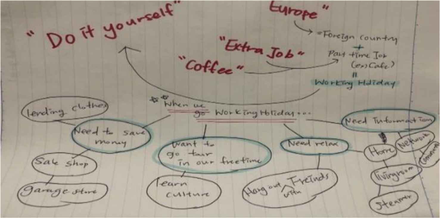 Story theme. Four things that the students on Working Holiday need might be Cheap clothes, Information, Relax and Tour.